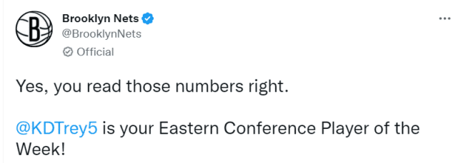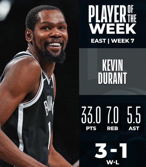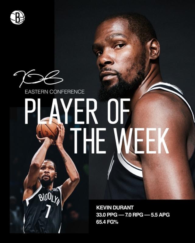 上周,篮网3胜1负,杜兰特场均33分7篮板5.5助攻,投篮命中率65.4%,篮网官方晒照祝贺杜兰特当选周最佳:是的,这些数字你没看错!