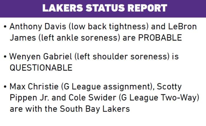 湖人对阵骑士的伤情更新:詹姆斯(左脚踝酸痛)和浓眉(背部紧张)大概率出战,加布里埃尔(左肩酸痛)出战成疑,克里斯蒂、小皮蓬和斯威德都被下放到发展联盟,跟随南湾湖人打比赛。