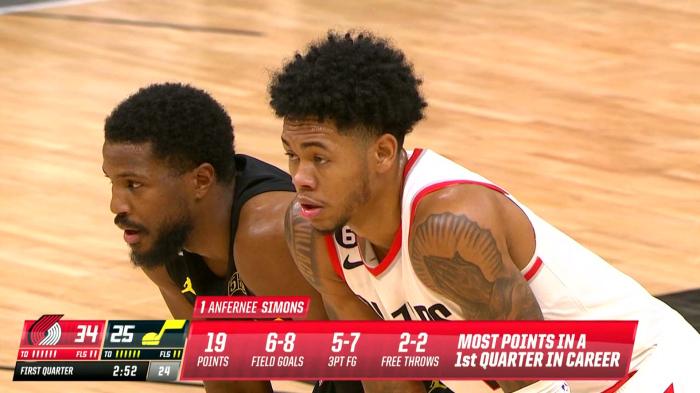 首节比赛,开拓者新星西蒙斯手感滚烫,持球反击上篮,外线火力全开,单节投进5记三分杀红眼,期间他更是在短短2分钟连续4记三分,单节10投8中独砍23分,在西蒙斯的疯狂输出下,开拓者第一节40-31领先爵士9分。
