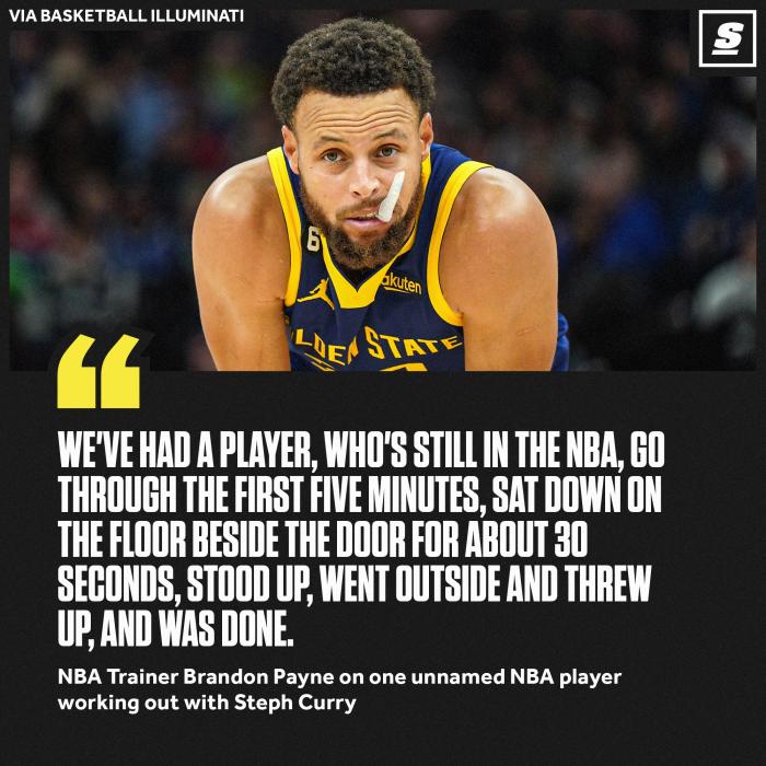库里的伟大源于他的辛勤付出,据一位NBA训练师透露,库里的训练强度很大,他透露:有一名现在仍在NBA中打球的球员,他曾经和库里一起训练,只坚持了五分钟,然后在门旁边的地板上坐了大约30秒,站起来,走到外面吐了,然后就不练了。
