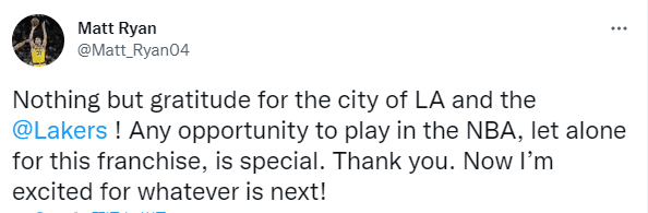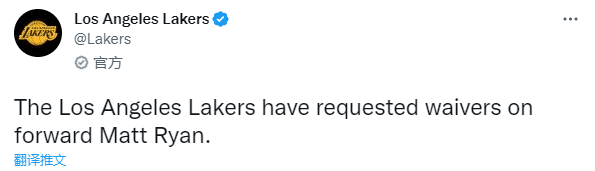 瑞安发推感谢湖人:除了感谢洛杉矶和湖人队,还感谢任何在NBA打球的机会,为湖人效力真是太特别了,谢谢你,现在我对接下来的一切感到兴奋!