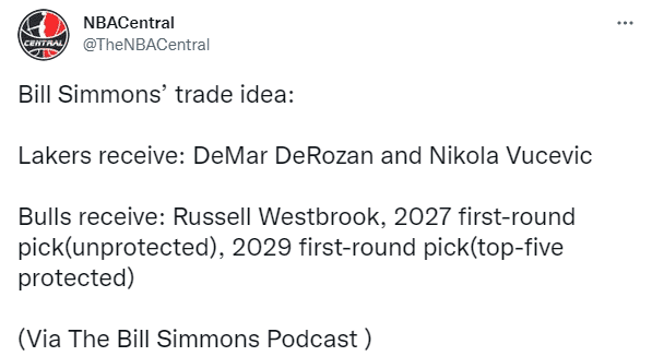 NBA名记记者Bill Simmons在节目中建议湖人3换2引援德罗赞和武切维奇,具体的交易方案是——湖人送走威少、2027年首轮签(无保护)和2029年首轮签(前五顺位保护),从公牛得到德罗赞和武切维奇。