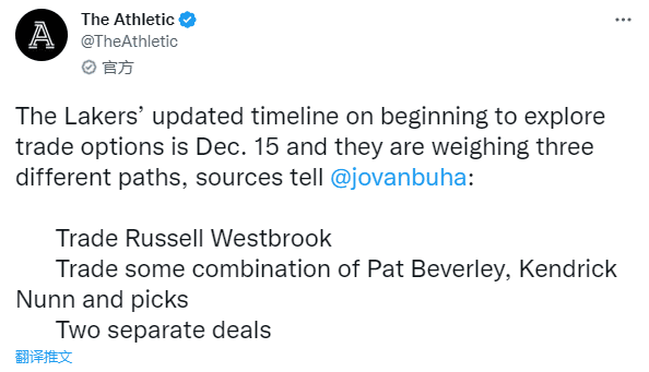 据湖人记者Jovan Buha报道,湖人将在12月16日交易日开启后进行阵容升级,目前他们有三种潜在的交易方案:1、交易威少;2、打包交易贝弗利、纳恩、选秀权;3、进行两笔单独的交易。