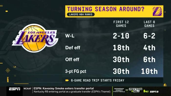 本赛季湖人开赛仅仅拿到2胜10负的糟糕战绩,伤病和三分投射糟糕是他们战绩不佳的原因;不过最近一段时间,湖人找回外线准星,伤员也已回归,近8战6胜2负;但如此阵容貌似仍不具备冲冠实力,因为在12月16日后,湖人很可能通过交易来提升阵容。