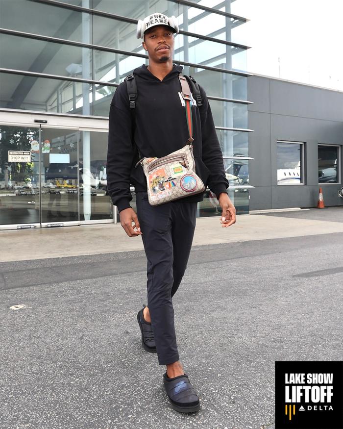 肯巴-沃克戴着棒球帽,头上夹着一副耳机,背着双肩包和斜挎包,穿着休闲鞋;达米安-琼斯跟在詹姆斯和浓眉是身后。