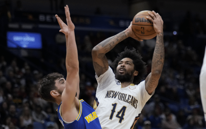 勇士惨败,禁区狂丢60分,篮板35-49输14个,助攻16-30输14个,全场27次失误以及三分43投仅10中(三分命中率仅23%),勇士惨遭输得太惨,本赛季已经被鹈鹕双杀,英格拉姆轻松拿到34分,锡安复出之战仅打23分钟,贡献9分4助攻2篮板。