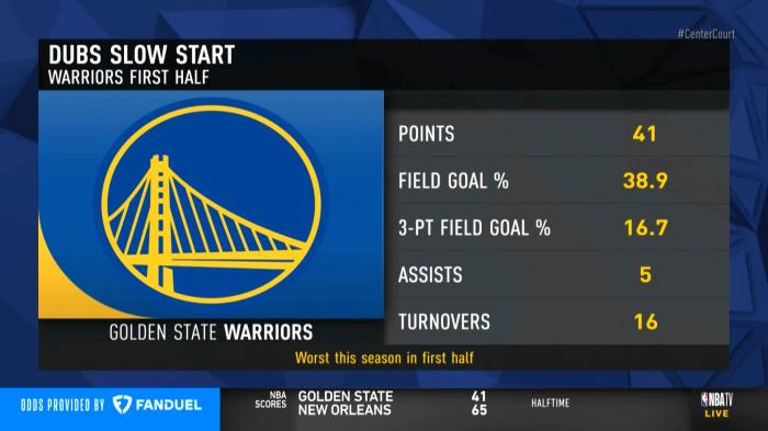 勇士残阵的耻辱一战,上半场全队得到41分,投篮命中率38.9%,三分命中率16.7%,助攻5次却出现多达16次失误,这五项数据都创赛季上半场最差纪录。