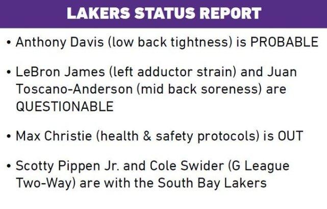 来源:24直播网11-20 19:3624直播网11月20日,湖人官方公布了最新的伤病报告,詹姆斯(左内收肌拉伤)和托斯卡诺-安德森(背部酸痛)的状态同为出战成疑(questionable,50%上场可能),浓眉(腰部紧张)的状态是大概率出战(probable,75%上场可能)。克里斯蒂触发健康安全协议,继续休战。小皮蓬和斯维德仍在G联赛的南湾湖人效力。