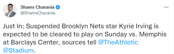 据名记shams报道,欧文预计将获准在下周一对阵灰熊的比赛中复出,还报道欧文获准复出的内幕,篮网和联盟都对欧文在整个过程中所做的一切很满意,欧文超额完成了篮网提出的归队要求;杜兰特坦言他们非常想念欧文。