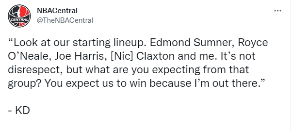 杜兰特公开表达对现有阵容的不满,甚至直言不能指望篮网首发阵容,换言之,KD认为篮网阵容的纸面实力太差;杜兰特如此言论引热议。