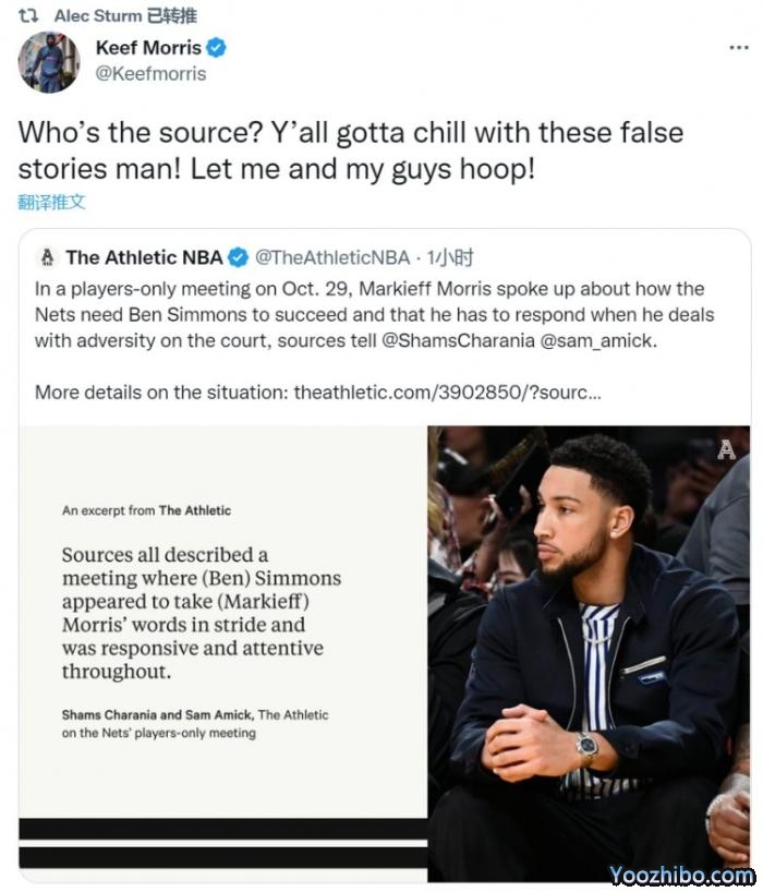 shams还爆料,在10月30日篮网输给步行者后,球队召开球员会议,老将马基夫-莫里斯在会议上当着大伙的面对本-西蒙斯说球队需要本西打好,而且本西需要做给出表现,去处理在场上所遭遇到的困难;西蒙斯似乎淡然接受了大莫里斯的话,并在会议上自始至终反响积极、专心致志。