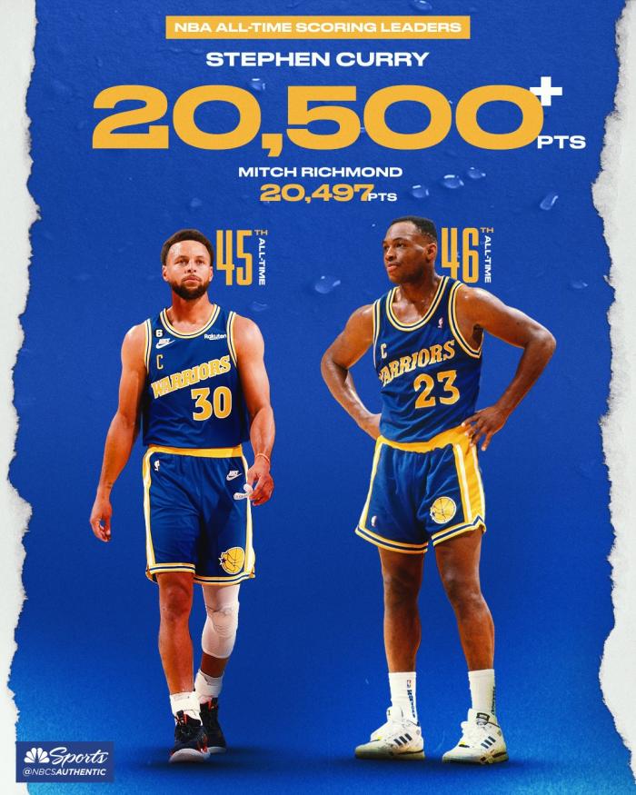 3、库里常规赛总得分超越勇士名宿米奇-里奇蒙德,升到NBA历史得分榜第45位