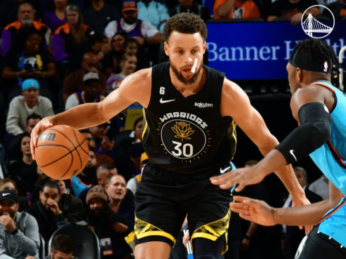 末节勇士替补阵容追分,太阳立即回应,库里上场后妹夫连续命中两记三分,库里连得4分回应,库里三分对飚布克,库里上篮被布克帽掉,库里继续支撑,无奈比赛早早失去悬念,库里遭遇里程悲。