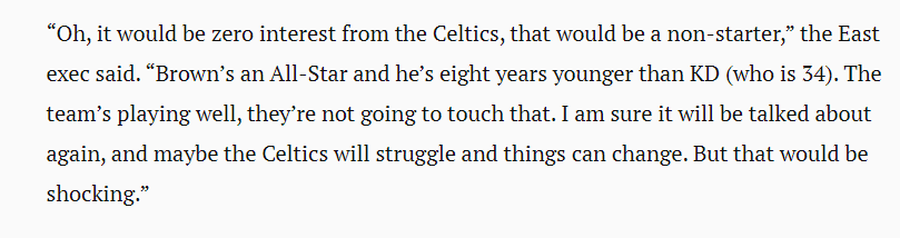 今年休赛期,杜兰特申请离队时凯尔特人曾想用布朗去和篮网谈判交易KD,不过双方谈判没有实质性进展;进入东部某高管表示:目前凯尔特人对杜兰特的兴趣为零。他们不可能主动重启交易谈判。布朗是全明星,比杜兰特小8岁。绿军现在打得很好,他们不会碰这个的。我相信这件事还会被谈起,如果凯尔特人打得挣扎,事情可能会改变。但那将是令人震惊的。