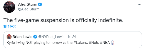 欧文因禁赛继续缺战快船,这是欧文被禁赛的第5场比赛,不过下一场对阵湖人,欧文仍旧缺席比赛,篮网记者Alec Sturm表示欧文正式无限期停赛。