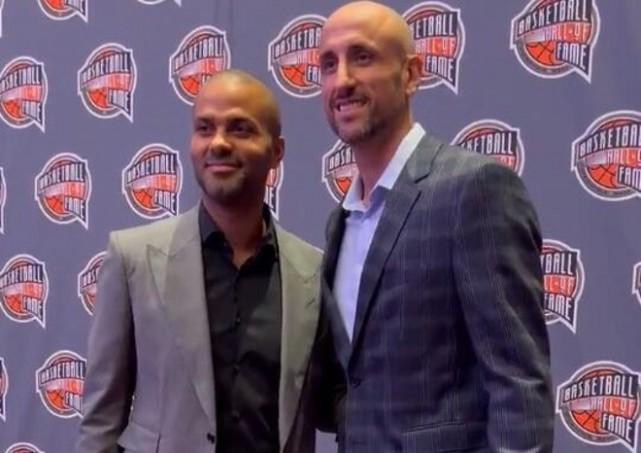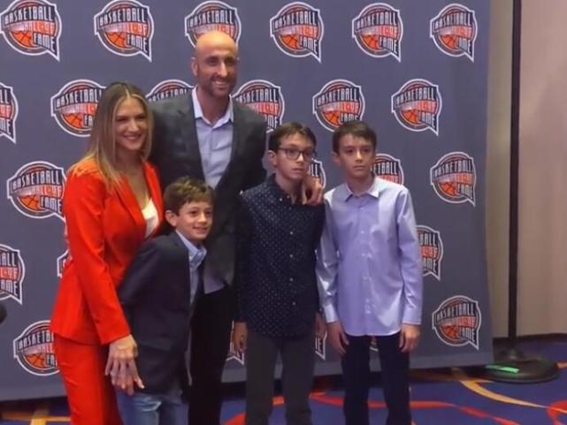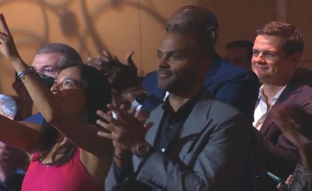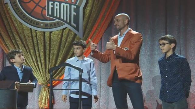 吉诺比利带着三个儿子上台接受名人堂夹克,有趣的是两个儿子亲手为父亲穿上了这件象征无上荣耀的夹克。另一个儿子捧起名人堂的戒指。前队友帕克在场下微笑鼓掌,两人在马刺合作多年,吉诺比利的大日子,他一定要来捧场。