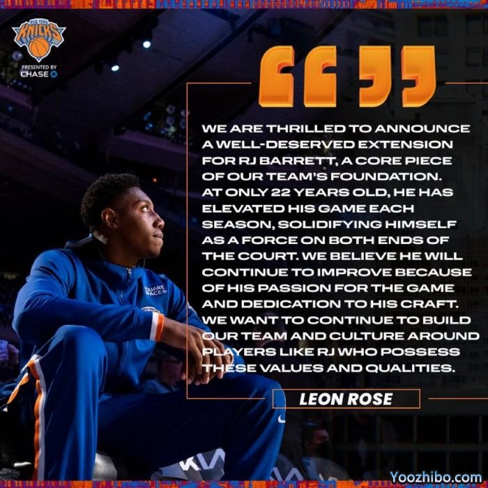 骑士和爵士达成米切尔交易之后,尼克斯官方宣布与巴雷特续签4年1.2亿美元的大合同,22岁巴雷特成为尼克斯队史最年轻亿元先生,也是队史近23年第一位提前续约的首轮新秀。