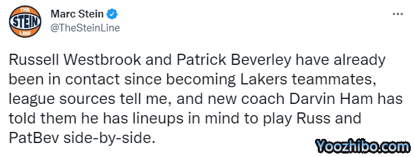 据名记Marc Stein报道,自从威少和贝弗利成为湖人队友之后,他们就一直保持着联系;此外湖人新帅哈姆告诉他们,他已经准备了一些让威少和贝弗利同时出场的阵容方案。
