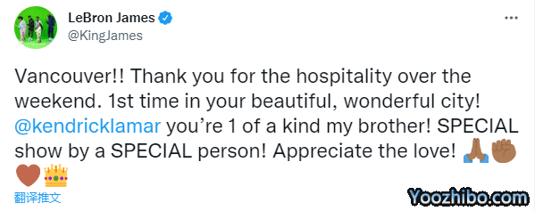 詹姆斯发推回顾温哥华之旅,配文写道:温哥华!!感谢你们上周末的热情款待。这是我第一次来到你们美丽且美妙的城市!@kendricklamar你是我兄弟中的一员!特别的人献上的特别演出!感谢爱意!