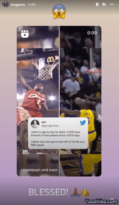 詹姆斯上演NBA首秀时年仅18岁零308天(共计6878天),而如今距离詹姆斯首秀已有6881天(18年零311天);换言之,詹姆斯以NBA球员身份已经度过了生命中一半以上的时间,对此詹姆斯本人转发如此数据,配上一个震惊的表情并配文写道:这是恩赐!(双手合十和王冠表情)