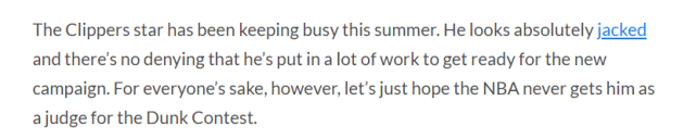 美媒clutchpoints转发这一消息时,表示这位快船球星休赛期忙于训练,变壮了不少,但也调侃说为了每个人的利益,我们只希望NBA永远不要让他担任扣篮大赛的评委。