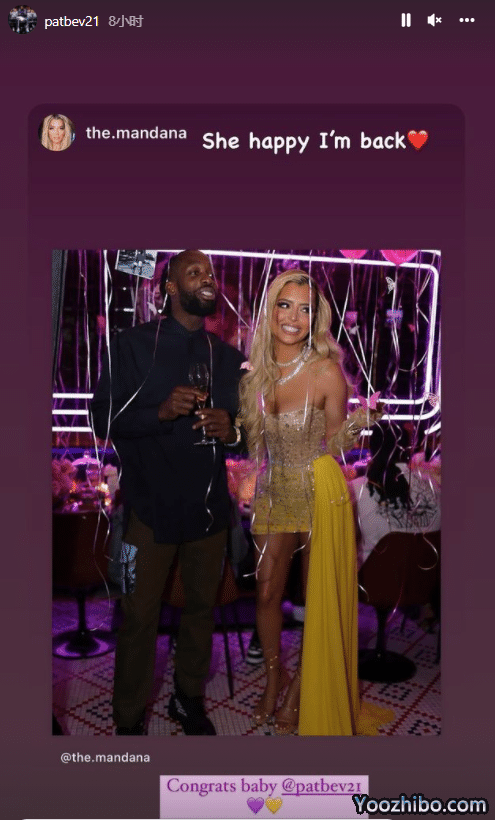 贝弗利不仅转发湖人官宣其加盟的动态,而且晒出自己抵达湖人球馆的画面;贝弗利女友晒照庆祝贝弗利重回洛杉矶,Mandana Bolourchi在个人社交媒体晒出二人合照,并配文写道:为回到洛杉矶干杯,恭喜宝贝;贝弗利回复女友:她很高兴我回到洛城。