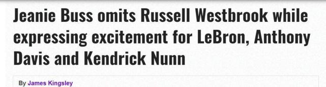 美媒LakersDaily表示,和一年前这个时候相比,珍妮-巴斯对威少的态度已经截然不同。当时她认为威少是湖人夺取总冠军的最后一块拼图,而现在,她连提都没提威少的名字了。
