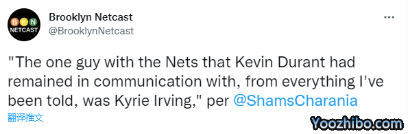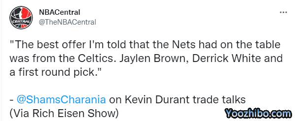 名记shams透露,据我所知,凯文-杜兰特一直与篮网队保持联系的人是凯里-欧文;还透露篮网收到的最好报价来自凯尔特人,他们的报价是杰伦-布朗、德里克-怀特和一个首轮选秀权。