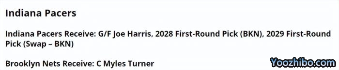 方案1:篮网送出乔-哈里斯、2028年首轮签和2029年首轮互换权,得到步行者的迈尔斯-特纳