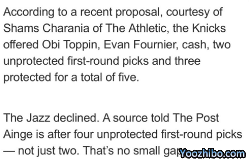 爵士和尼克斯关于米切尔的谈判已经持续一月有余,但由于双方尤其是爵士方面,并没有非常迫切想要完成交易,因此这桩谈判已久处于拉扯阶段。而尼克斯最新给出的这个交易筹码,其实已经非常接近爵士的要价,5个首轮+2名球员+现金,等于是1换8的交易,爵士其实应该知足了。