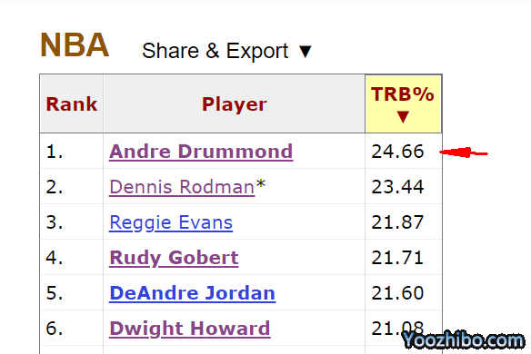 当然,大家时代不同,上场时间不同,场均数据也不是完全公平。再来看另一项数据,篮板率,指的是球员在场时,他的篮板占总篮板的比率。
