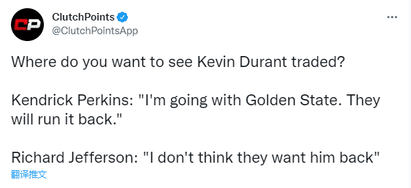 新赛季杜兰特会为哪支球队效力?凯尔特人正试图通过交易引援KD,名嘴帕金斯希望杜兰特重返勇士,但杰弗森表示勇士不希望他回归;杰弗森还希望杜兰特能加盟一支拥有超巨和潜在全明星的球队,否则还不如留在篮网。