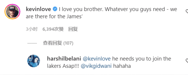 乐福和妻子伯克也来到詹姆斯的社媒上留言。乐福写道:“我爱你兄弟,无论你们需要什么,我们都会在那里,詹姆斯。”很快有球迷回复调侃乐福:“他需要你尽快加入湖人,哈哈哈哈!”乐福的妻子伯克也给詹姆斯留言道:“(六颗爱心表情)我们爱你!”