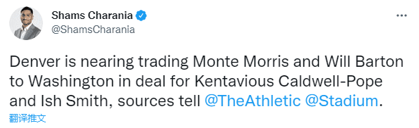 来源:24直播网06-30 11:3624直播网06月30日讯 ,据名记Shams报道,掘金将交易蒙特-莫里斯和巴顿,从奇才换来波普和伊斯梅尔-史密斯,随后沃纳罗斯基确认掘金将和奇才达成2换2交易,波普新赛季驰援约基奇冲击总冠军。