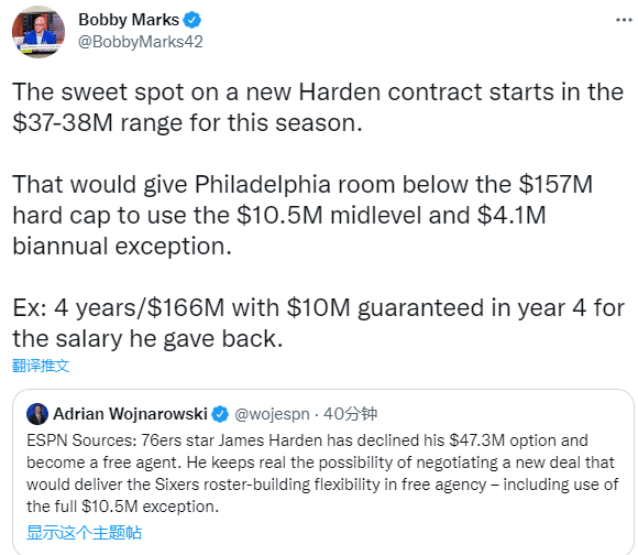 据薪资专家Bobby Marks报道,哈登下份合同的最佳起薪平衡点约为3700-3800万美元,这样76人的总薪资将会低于1.57亿美元的硬工资帽,球队可使用1030万美元的中产特例和410万美元的半年特例。