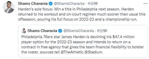 本来哈登有资格与76人续签一份起薪为4603万美元的新合同,但未来球队补强争夺总冠军,哈登将会降薪续约,薪资专家认为哈登将签起薪为3700万-3800万美元的新合同,相当于最多一年少拿900万美元。
