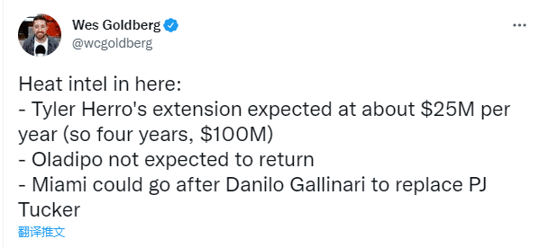 6、希罗将和热火提前续约,希罗的续约价格合同预计年薪为2500万美元,热火记者Wes Goldberg跟进报道,这是一份4年1亿美元的合同。