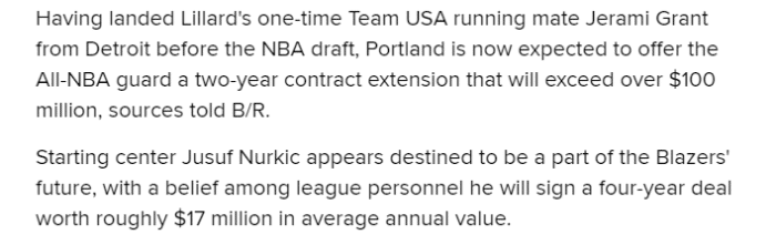 5、开拓者预计续约首发中锋努尔基奇,双方可能签下一份4年合同,平均年薪为1700万美元左右,也就是一份4年约6800万美元的新合同。