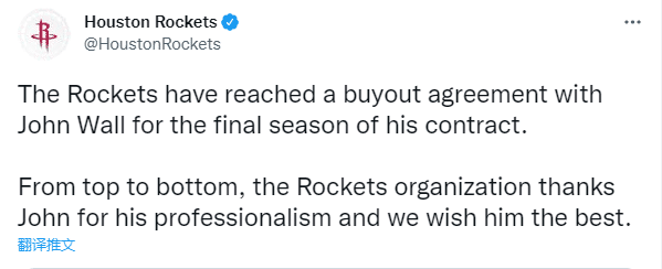 火箭官方今日宣布,球队已正式与后卫约翰-沃尔达成买断协议,火箭官推晒照感谢沃尔,并且配文写道:我们全队上下都对沃尔的职业素养表达感谢,希望他未来一帆风顺。