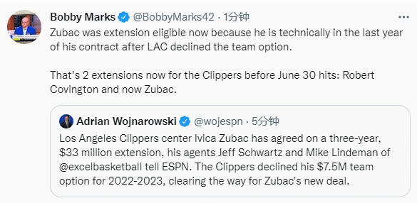 沃尔即将加盟,与此同时快船已经和祖巴茨签下3年3300万美元的新合同,此前快船拒绝了祖巴茨下赛季750万美元的球队选项,目的就是要和他提前续约。