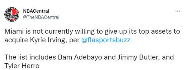 据报道,目前热火不愿意放弃任何顶级资产去追求欧文,这些资产包括阿德巴约、巴特勒和希罗。