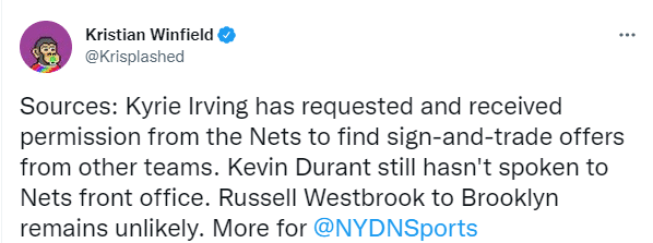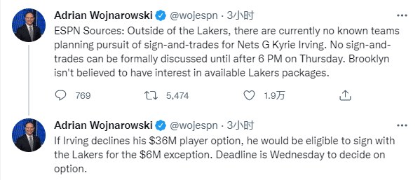 据沃纳罗斯基报道,目前除湖人外,没有已知的球队计划通过先签后换的方式得到欧文;另一方面,篮网对湖人队提供的以威少为主体的交易筹码不感兴趣。