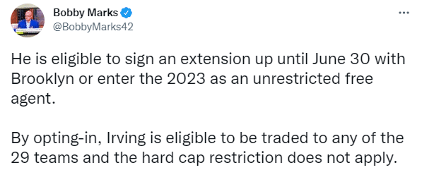 Bobby Marks还表示欧文和篮网有一年的时间来达成新合同。