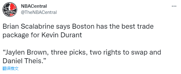 前NBA球员“白曼巴”斯卡拉布莱恩在节目中表示:没有球队能给出比凯尔特人更好的报价了,打包杰伦-布朗、泰斯、3个首轮和2个选秀互换权换杜兰特。