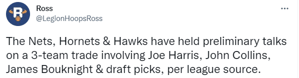 来源:24直播网06-27 11:0724直播网06月27日讯 ,篮网酝酿大交易,据美媒Legion Hoops报道,消息人士透露,篮网、黄蜂、老鹰已就三方交易展开了初步商谈;交易包含的筹码有乔-哈里斯、约翰-科林斯和黄蜂21年新秀詹姆斯-伯克奈特以及未来选秀权。