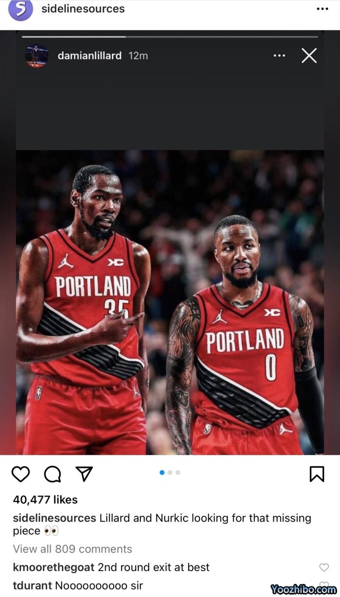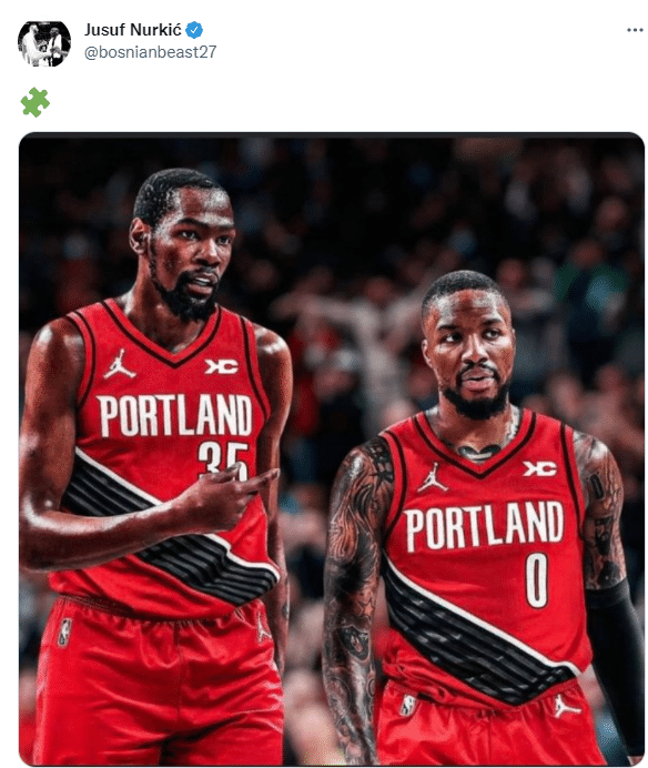不久前,利拉德突然在Ins上晒出自己与杜兰特身穿开拓者35号球衣的P照,公开表达想要和联手杜兰特的意愿;之后努尔基奇也晒出这一张合影P照,并且发推写道:拼图。