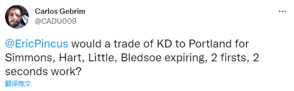 还有球迷列为杜兰特1换8的疯狂交易方案,开拓者得到杜兰特,送出的筹码是西蒙斯、哈特、利特尔、布莱德索、2个首轮签和2个次轮签。