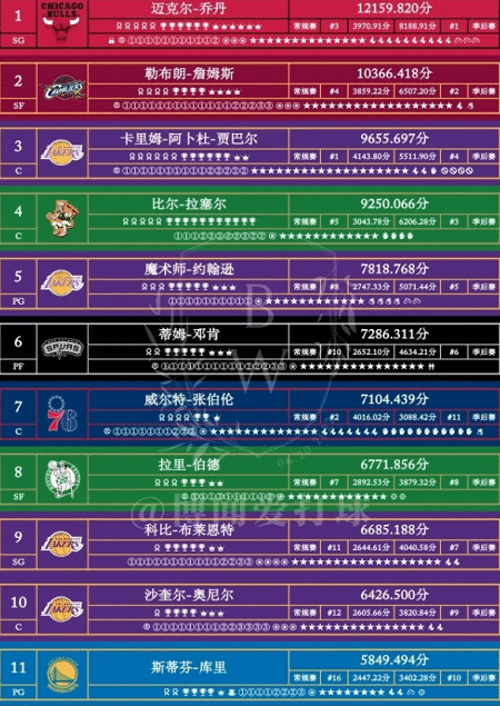 甚至还有媒体针对NBA历史地位进行“计算公式”,BBR通过ACPL积分细则方案重新排了历史百大巨星,公式:总分=成就分+贡献分+能力分+记录分。根据数据显示,乔丹第一,詹姆斯第二名,库里第11名,无缘前十。