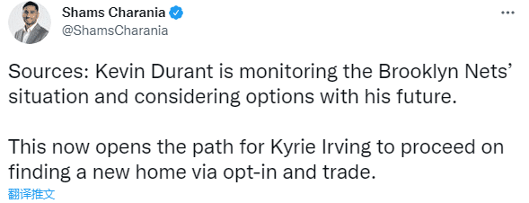 据名记Shams报道,杜兰特正密切关注篮网的操作情况,并会根据结果考虑自己的未来选择;今夏杜兰特并没有像往常那样的积极招募自由球员,杜兰特的此种态度让欧文获得了加盟其他球队的机会,而杜兰特可能因欧文离队而申请离队。