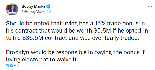 据薪金专家Bobby Marks表示,欧文合同中包含15%的交易保证金,如果欧文执行3650万美元的球员选项后被交易,保证金是550万美元,若欧文选择不放弃它,篮网必须支付这550万美元。